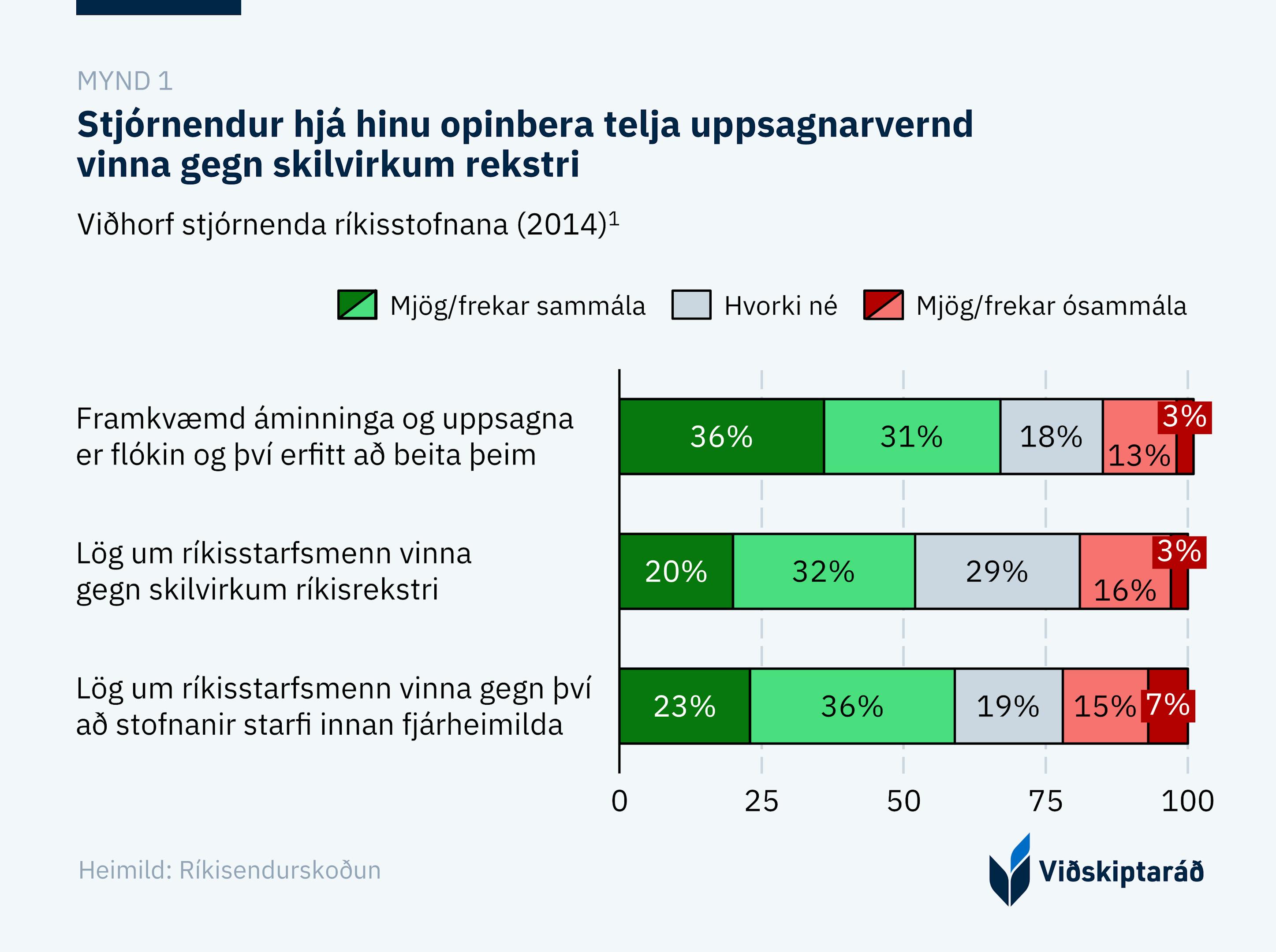 Ríflega tveir af hverjum þremur stjórnendum hjá hinu opinbera telja framkvæmd áminninga og uppsagna flókna og því sé erfitt að beita því úrræði (mynd 1). Þá telur meirihluti þeirra lögin vinna gegn því að stofnanir starfi innan fjárheimilda og rúmlega helmingur að starfsmannalögin vinni gegn skilvirkni í rekstri ríkisins.