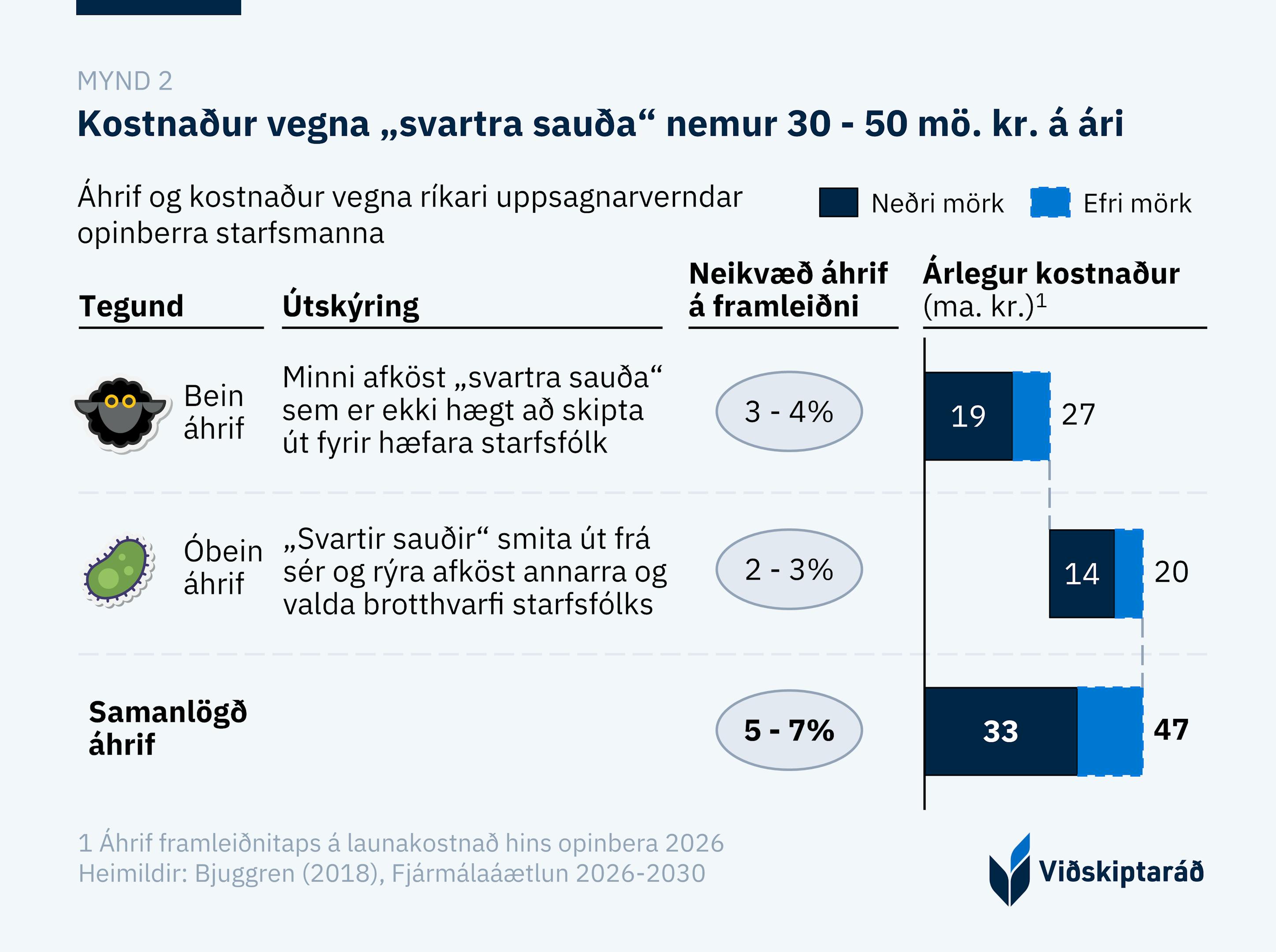 Viðskiptaráð áætlar að ríkari uppsagnarvernd opinberra starfsmanna kosti ríki og sveitarfélög 30 til 50 ma. kr. á ári (mynd 2). [3] Annars vegar eru bein neikvæð áhrif af verndinni, sem endurspeglast í minni afköstum þeirra „svörtu sauða“ sem ekki er hægt að skipta út fyrir hæfara starfsfólk áætluð 3-4% á framleiðni á ársgrundvelli. Hins vegar eru óbein áhrif, sem endurspeglast í neikvæðum áhrifum á vinnustaðinn í heild og valda brotthvarfi starfsfólks áætluð 2-3%.
