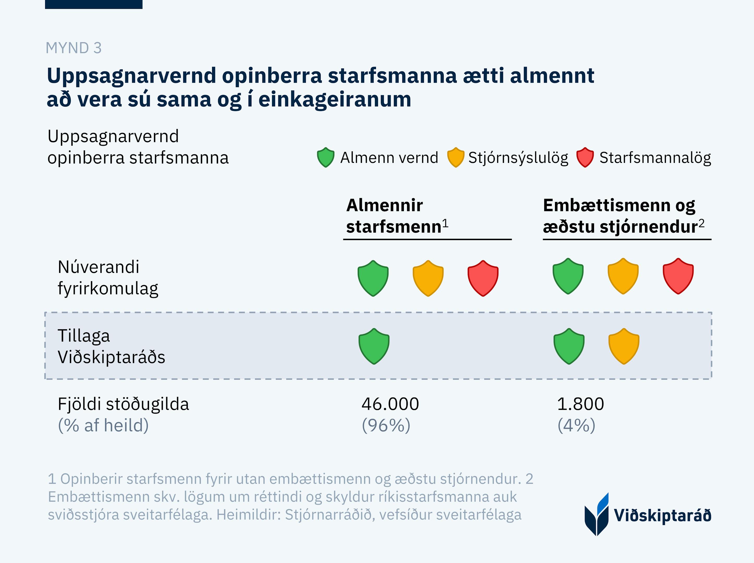Að mati Viðskiptaráðs ætti umframvernd einungis að ná til embættismanna og æðstu stjórnenda og takmarkast við vernd stjórnsýslulaga án sérstakrar áminningarskyldu starfsmannalaga (mynd 3).