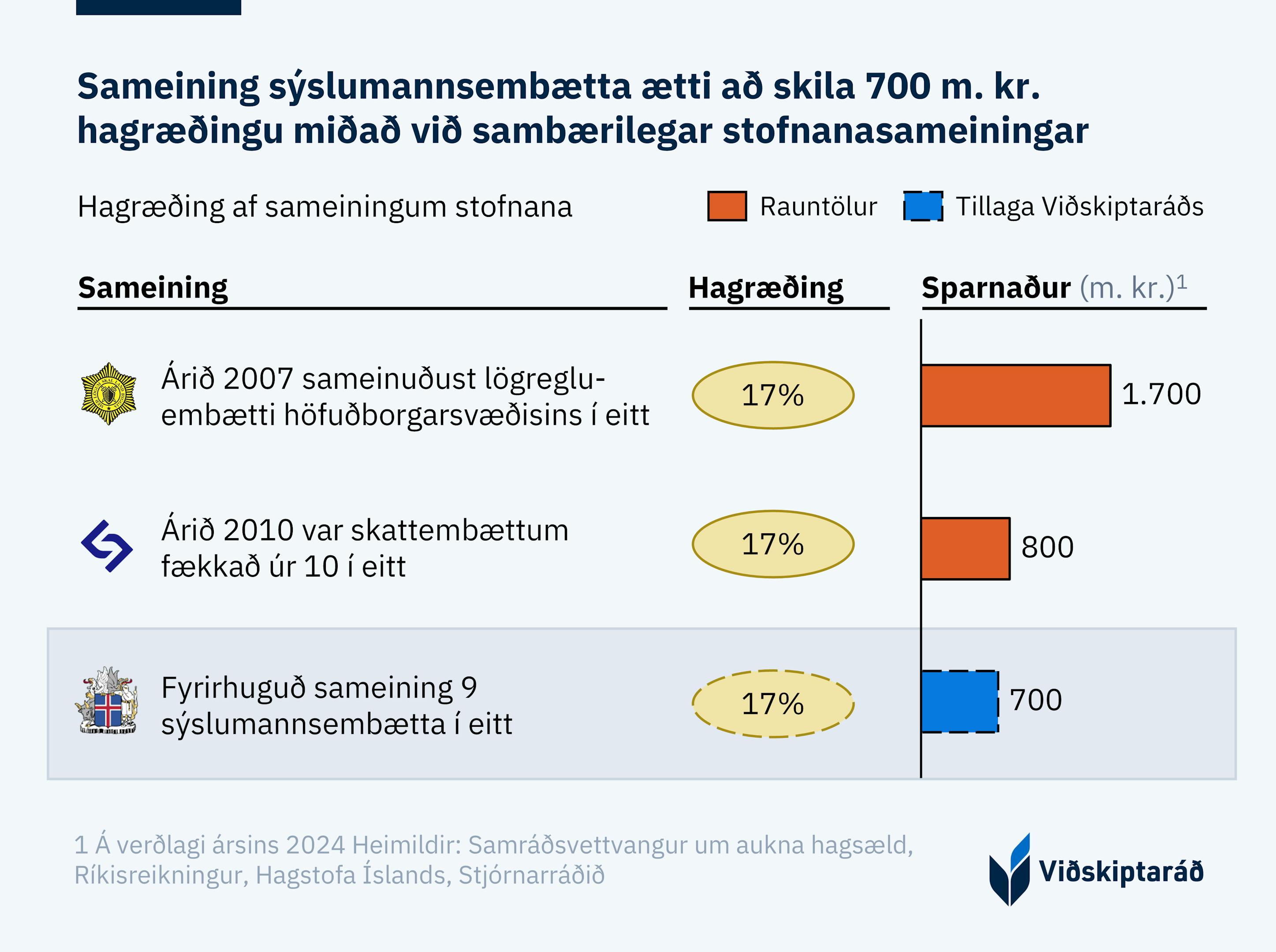 Sameining sýslumannsembætta ætti að skila 700 m. kr. hagræðingu miðað við sambærilegar stofnanasameiningar á síðustu árum (sjá mynd). Þegar lögregluembætti á höfuðborgarsvæðinu voru sameinuð árið 2007 náðist fram 17% rekstrarhagræðing samhliða bættri þjónustu embættisins. Þegar stofnanir Skattsins voru sameinaðar í eina árið 2010 náðist fram 17% rekstrarhagræðing.[1] Að mati Viðskiptaráðs ætti sameining sýslumannsembætta að skila sömu hlutfallslegu hagræðingu og þessar tvær sameiningar, eða 17%. Það jafngildir 700 m.kr. hagræðingu á ári miðað við fjárheimildir embættanna í dag.